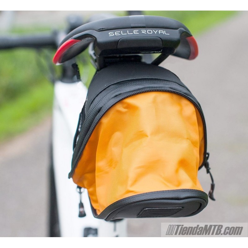 SKS Explorer is an expandable saddle bag with a capacity up to 1 liter closed, and up to 1,8l expanded. It allows carry a 29 inches inner tube, a multitool, patches box, etc. Water repelent materials and waterproof zipper. Robust and fast saddle attachment system.