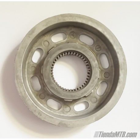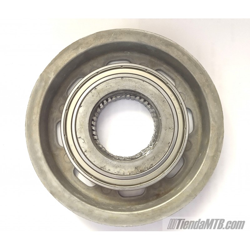 Brose motor main pulley with the bearing race and sprag bearing (PLB20126 normal plastic cage) mounted. Preowned pulley in good condition, and new bearings. External PLB20124 bearing included.