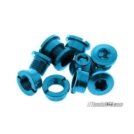 High quality short aluminium 7075 Chain Ring Bolts. Narrow format, ideal for holding one chainring (DH, fixed, 1x10, 2x10...) without external protector. 5 bolts included. Color blue.