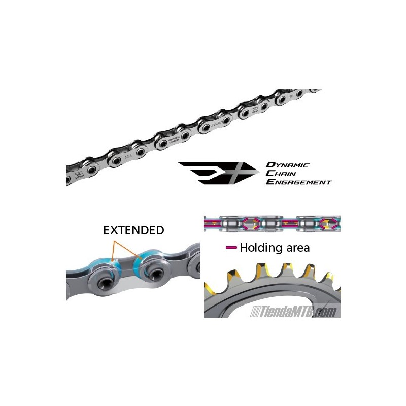 The Shimano Deore M6100 chain provides smooth shifting and enhanced chain retention thanks to an extended portion of the inner plate. The new chain features QUICK-LINK assembly and is optimized for HYPERGLIDE+ cassettes and DYNAMIC CHAIN ENGAGEMENT+ chainrings.