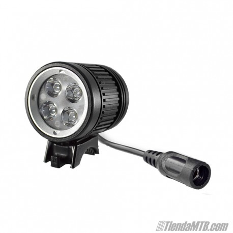 High power LED spotlight for night bike routes or any other sports at night. Its powerful light of 1600 lumens allows routes trails in closed nights (no moon, streetlights, etc). 4 LED modes. Up to 2.2 hours at maximum power or 7h at minimum power.