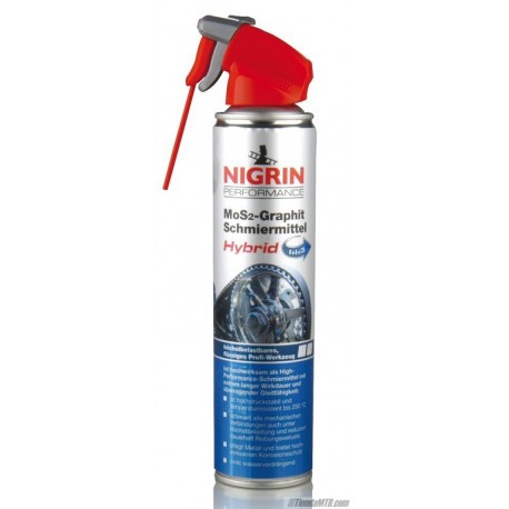 The NIGRIN Hybrid formula with MoS², WS² and graphite lubricates all mechanical joints even under the highest stress. Effective for extremely long periods and offers outstanding lubricating properties with metallic substrates. Water-repellent. 400ml spay.