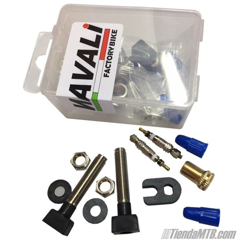 2 detachable tubeless presta valves with caps and nuts + presta-schrader adapter + 2 flat O-ring + 2 valve washer + wrench to open and close the valve. Very confortable, in order to introduce the sealant, the valve can be disassembled without disassemble the tyre. The valve core can also be tighten with spoke wrench or a small flat one.