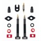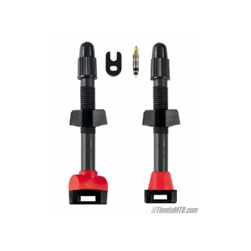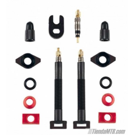 A Barbieri valve kit to use in tubeless wheels, and valid for use with mousse inserts. The kit include 2 detachable tubeless presta valves with caps and nuts, and two types of base seals. Made in carbon to be very light.