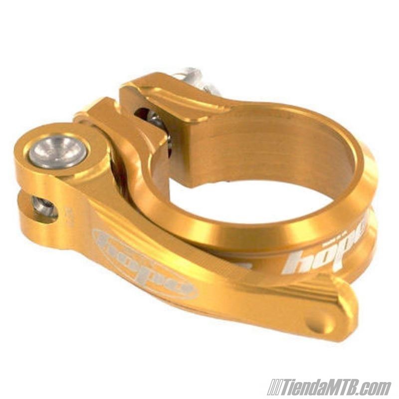 Light Hope aluminum seatpost clamp with quick release. QR lever pivots on a brass seat for durability.