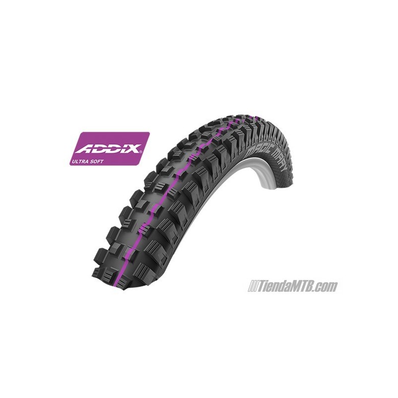 Neumático de motocross para hacer Enduro con tu bici eléctrica de 27,5 Plus. La cubierta Schwalbe Magic Mary ofrece el máximo agarre con el compuesto Ultra Soft (linea morada) con un dibujo que todos sabemos que funciona. Máxima protección frente a pinchazos y cortes gracias a la doble carcasa DH. Aro rígido. Disponible en medida 27.5x2.60.