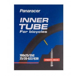 Cámara Panaracer para bicicletas con rueda de 700 o 28 pulgadas (carretera, gravel, fixed, paseo...). Medidas: 700x25-35C o 28x1.0-1 1/4, ETRTO: 25/32-622/635. Con válvula fina de 48mm. Válidas para llantas de perfil bajo y medio.
