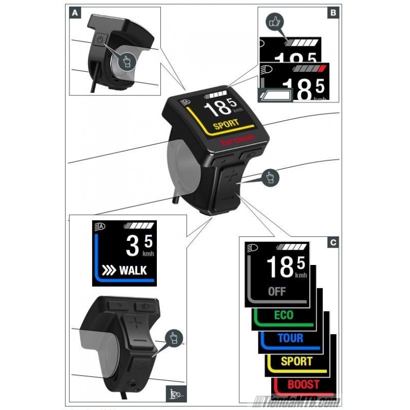 Pantalla muy compacta para motores Brose con un diseño muy cuidado. Display de 1.5 pulgadas con información de los valores principales. Botones para controlar el nivel de asistencia, el walk mode o la luz.