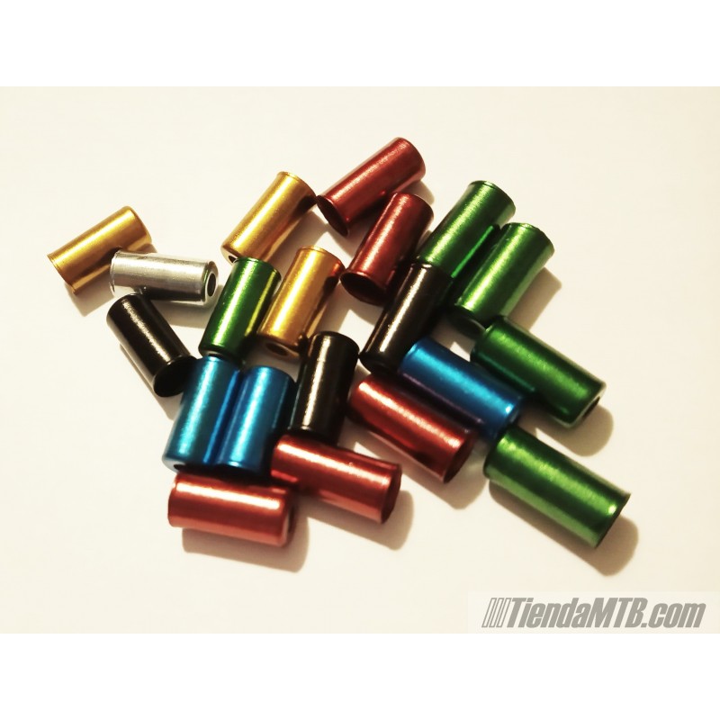 Topes de colores anodizados para funda de freno de 5mm en acero. Disponible en los colores: rojo, dorado, verde, plata, azul y negro. Precio por cada cabecilla individual.