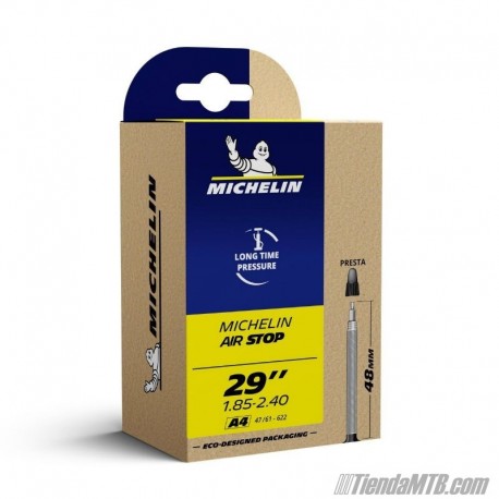 Cámara Michelin A4 Airstop Butyl de 29 pulgadas (A4) o de 27.5 pulgadas (B4) con válvula fina (presta/francesa). Fabricada en Europa por Michelin, esta cámara para bicicleta de montaña es de gran calidad, por lo que no se deforma al inflarla. Además las camaras Michelin AirStop son bastante ligeras, buscando un punto intermedio entre ligereza y capacidad de mantener el aire e incluso aguantar pequeños pinchos y abrasiones. La altura de la válvula fina te permitirá usarla incluso en llantas de perfil alto.