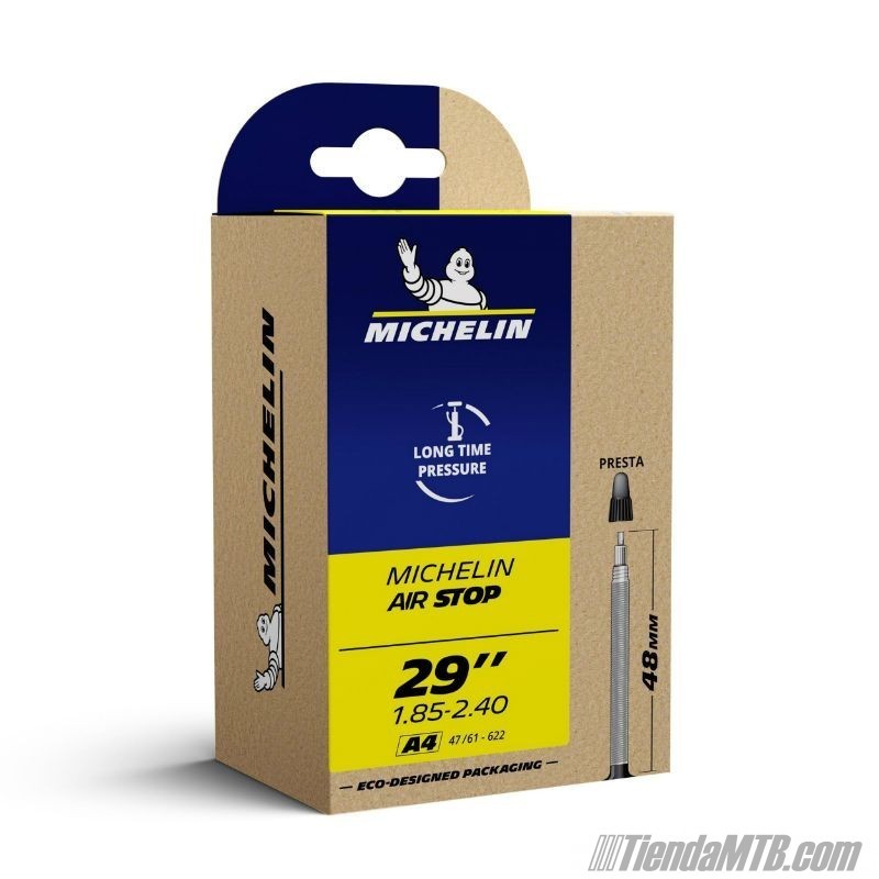 Cámara Michelin Airstop Butyl de 29 pulgadas (A4) o de 27.5 pulgadas (B4) con válvula fina de 48mm. Para anchos de 1.90-2.40. Cámara para bicicleta de montaña de gran calidad y bastante ligera.