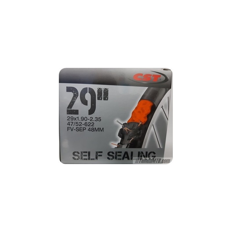 Cámara antipinchazos CST de 29x1.90-2.35 con válvula fina de 48 mm. Esta camara para ruedas de bicicleta de 29 pulgadas viene rellena con líquido sellante para evitar pinchazos.