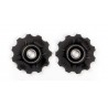 Roldanas de 11 dientes para todos los modelos de cambio trasero de Shimano de 9v, 10v y 11 velocidades y para varios modelos de cambio antiguos de SRAM (comprobar si la roldana superior es de agujero central o dos agujeros). Se incluyen dos rulinas y espaciadores.