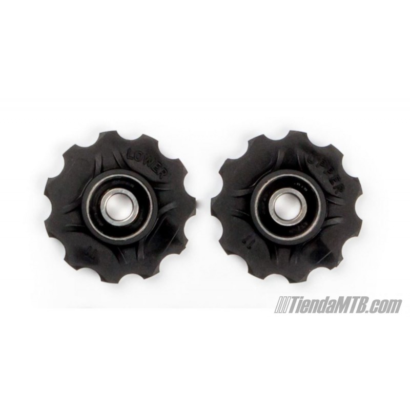 Roldanas de 11 dientes para todos los modelos de cambio trasero de Shimano de 9v, 10v y 11 velocidades, y para varios modelos de cambio antiguos de SRAM (comprobar si la roldana superior es de agujero central o dos agujeros).