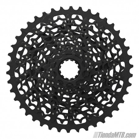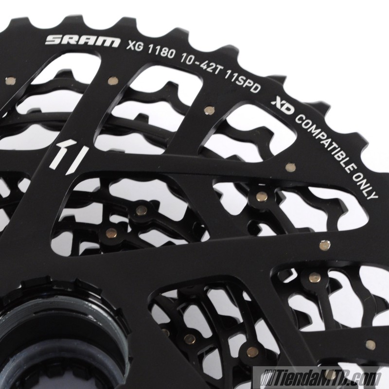 El cassette SRAM X1 de 11 velocidades (10-42) proporciona el mejor cambio con un peso muy ligero (315gr). El cassette SRAM 10-42 XG-1180 es solo para bujes con núcleo XD. El piñon de 10 dientes amplia el rango para tener buen desarrollo en cualquier terreno.