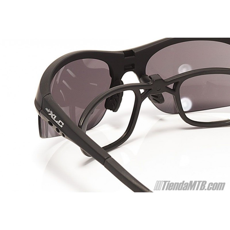 Gafas de sol XLC "Bahamas" SG-F01 con montura exterior color negro mate Soft-Flex. Montura interior extraible para cristales graduados 'Optical Frame'. Lentes ahumadas con 100% de protección contra los rayos ultravioletas. Además se incluyen dos pares de lentes de recambio, claras y amarillas, y cajita de transporte.