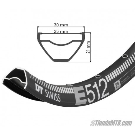 La llanta DT Swiss E512 es una llanta de 29 pulgadas para Enduro / All Mountain. Esta llanta para bicicleta de montaña es ligera pero muy robusta. Ancho interno de 25mm y preparada para tubeless ready, con un borde interno especial para no destalonar. Esta llanta para 29 pulgadas está disponible en 28 y 32 agujeros.