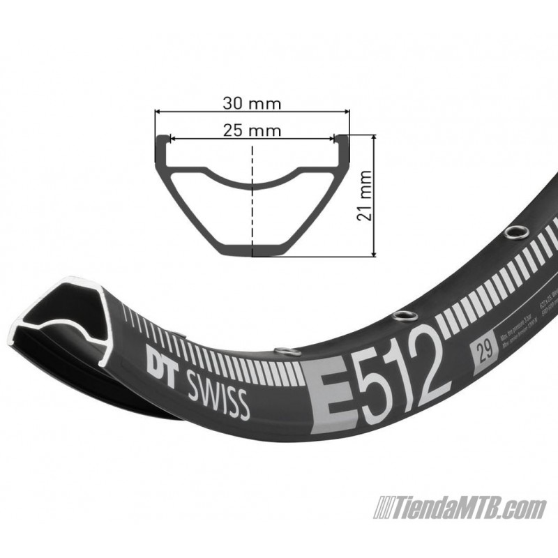 La llanta DT Swiss E512 es una llanta para Enduro / All Mountain. Esta llanta para bicicleta de montaña es ligera pero muy robusta. Ancho interno de 25mm y preparada para tubeless ready, con un borde interno especial para no destalonar. Esta llanta para 29 pulgadas está disponible en 28 y 32 radios.