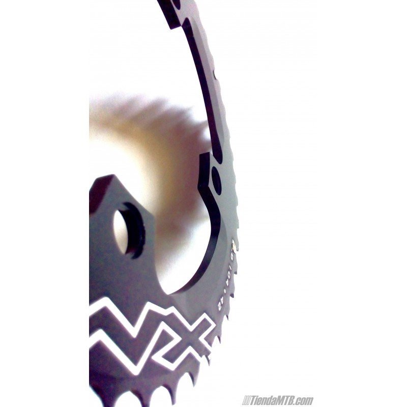 Plato pequeño (interior) para bicicletas de montaña para bielas de 2 platos SRAM (2x10v) en medida 80BCD. El plato Miche MTB XM TT está fabricado en Aluminio Ergal 7075, fresado en CNC y anodizado. Color negro. Peso 26d: 22gr.