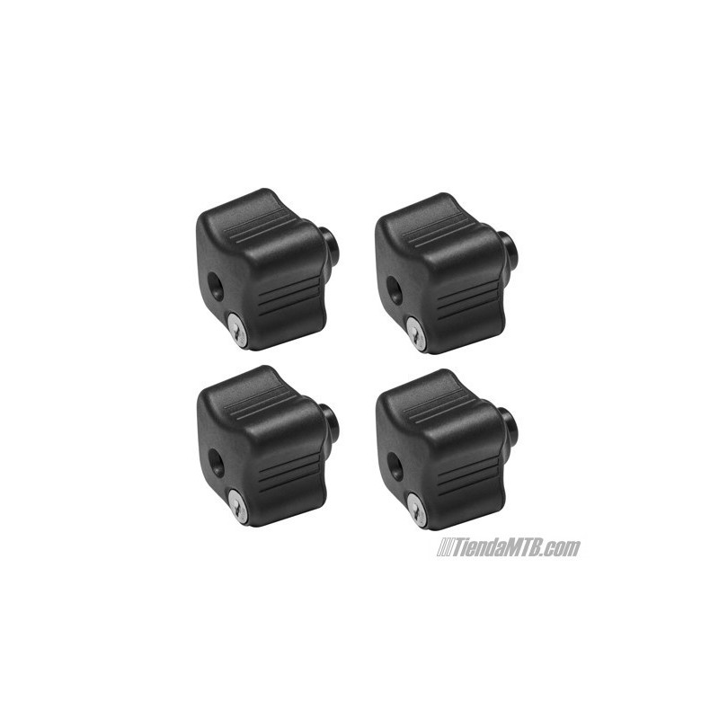Tuercas antirrobo con llave para portabicicletas. Ahora podrás asegurar tus bicicletas con estas palomillas cerrables con llave y evitar que en una parada con el coche o un despiste te roben la bicicleta. Todo ello sin perder la funcionalidad de abrir y cerrar con la mano sin necesidad de herramientas. Además su forma más en estrella de 4 puntas te permite hacer fuerza sin que se te resbalen, incluso con guantes.