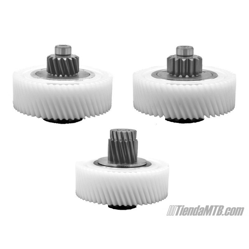 Engranaje de plástico blanco para ebikes con motores Yamaha PW, PW-SE, ST, TE, CE and PW-X, X2, X3 (y sus equivalentes de Giant). Incluye tanto el engranaje de nylon blanco como el eje central de acero con su engranaje, el rodamiento y el embrague, todo listo para ser montado directamente.