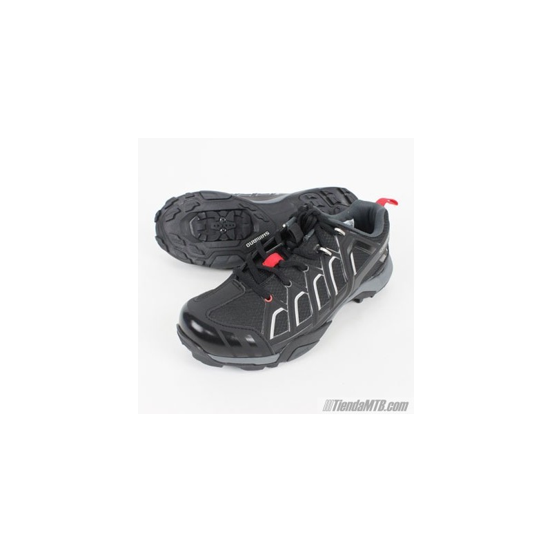 Zapatillas de MTB Shimano SPD SH-MT34L. Ventana para calas SPD con tapa. Entresuela con refuerzos en fibra de vidrio para una optima rigidez de la suela al pedalear. Todo ello con un diseño similar al de unas deportivas de calle y suela exterior de goma para andar por la ciudad sin llamar la atención.
